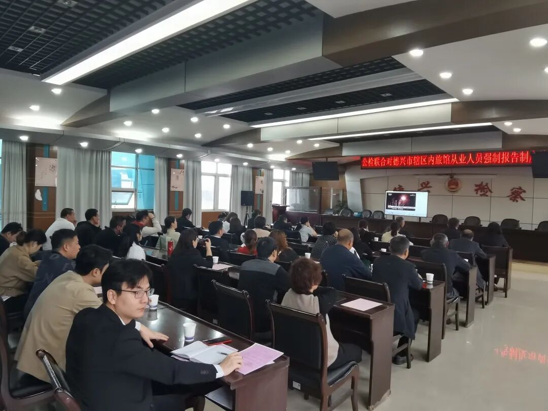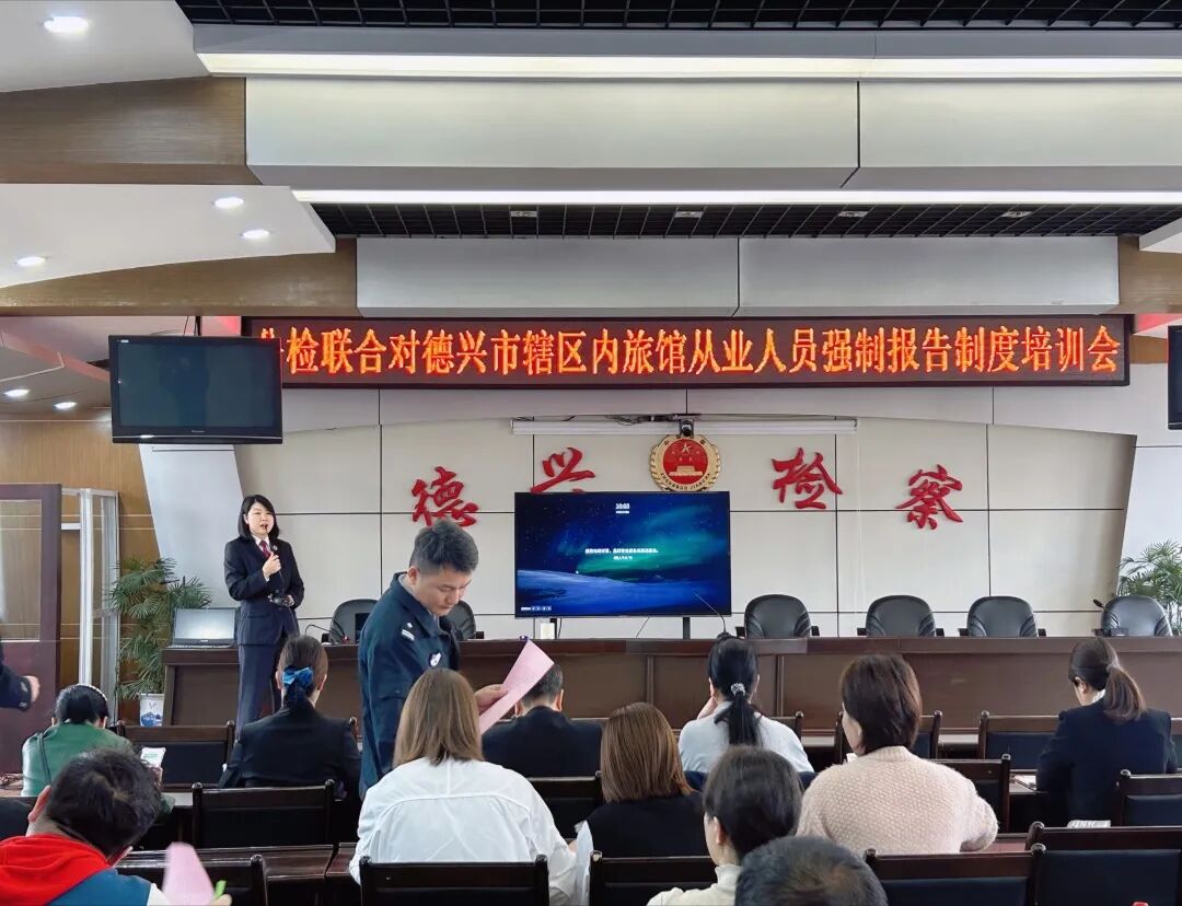 为贯彻落实《中华人民共和国未成年人保护法》,进一步推动德兴市辖区内宾馆、酒店等旅馆业认真落实强制报告制度主体责任。4月14日,德兴市检察院与德兴市公安局联合召开全市旅馆业强制报告制度培训会。