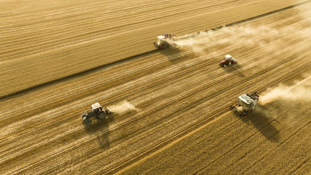 2025年6月4日,在河南省商丘市梁园区李庄镇潘堂村志诚种植农民专业合作社,农机手操作机械在农田作业(无人机照片)。新华社发(李恒 摄)