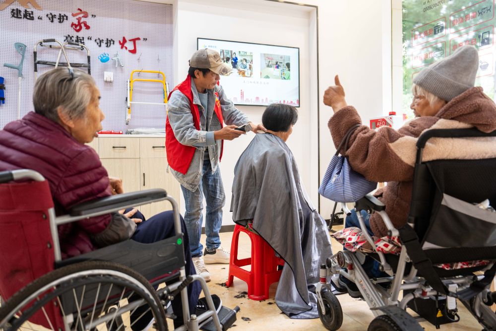 2025年11月6日,在湖南省长沙市望城区高塘岭街道湘陵社区,志愿者为老年人和残疾人士免费理发。新华社记者 陈思汗 摄