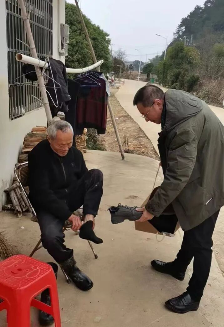 原来,在2023年春节来临之际,德兴市检察院驻张村乡界田村第一书记余烜和往常一样下村走访监测对象,脱贫户李社义就是他的走访对象之一。李社义一生未娶,膝下无儿无女,在他家中,细心的余烜注意到他的穿着和自己前几次走访时看到的一样,好似无论下雨天晴总是穿一双雨鞋。细聊之下了解到,孤身一人的李社义平时疏于对自己的打理,一双雨鞋成了他平时步行的“装备”。